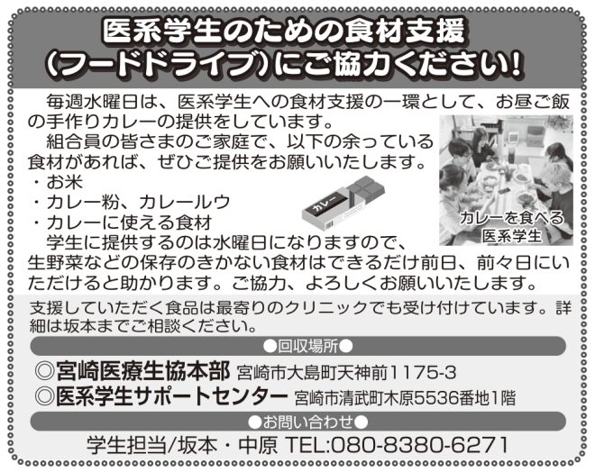 https://www.miyazaki-iryou.coop/news/%e5%8c%bb%e7%b3%bb%e5%ad%a6%e7%94%9f%e3%81%ae%e3%81%9f%e3%82%81%e3%81%ae%e9%a3%9f%e6%9d%90%e6%94%af%e6%8f%b4%ef%bc%88%e3%83%95%e3%83%bc%e3%83%89%e3%83%89%e3%83%a9%e3%82%a4%e3%83%96%ef%bc%89-33/医系学生のための食材支援(フードドライブ)にご協力ください!