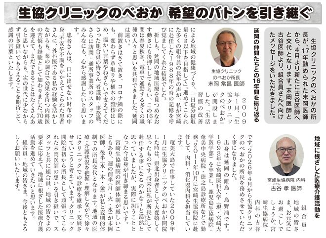https://www.miyazaki-iryou.coop/news/%e7%94%9f%e5%8d%94%e3%82%af%e3%83%aa%e3%83%8b%e3%83%83%e3%82%af%e3%81%ae%e3%81%b9%e3%81%8a%e3%81%8b-%e5%b8%8c%e6%9c%9b%e3%81%ae%e3%83%90%e3%83%88%e3%83%b3%e3%82%92%e5%bc%95%e3%81%8d%e7%b6%99%e3%81%90/生協クリニックのべおか 希望のバトンを引き継ぐ