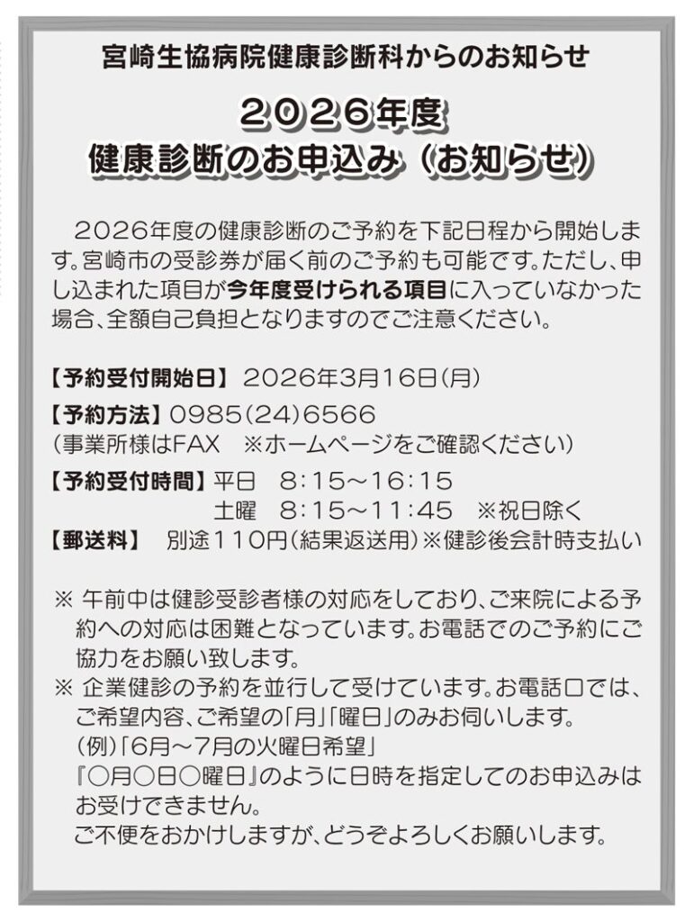 https://www.miyazaki-iryou.coop/news/2026%e5%b9%b4%e5%ba%a6%e3%80%80%e5%81%a5%e5%ba%b7%e8%a8%ba%e6%96%ad%e3%81%ae%e3%81%8a%e7%94%b3%e8%be%bc%e3%81%bf%ef%bc%88%e3%81%8a%e7%9f%a5%e3%82%89%e3%81%9b%ef%bc%89/