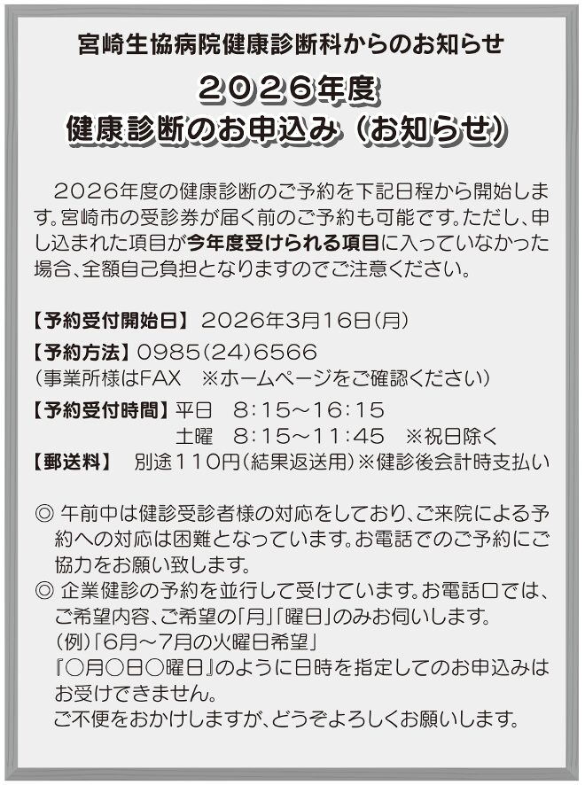 https://www.miyazaki-iryou.coop/news/2026%e5%b9%b4%e5%ba%a6-%e5%81%a5%e5%ba%b7%e8%a8%ba%e6%96%ad%e3%81%ae%e3%81%8a%e7%94%b3%e8%be%bc%e3%81%bf%ef%bc%88%e3%81%8a%e7%9f%a5%e3%82%89%e3%81%9b%ef%bc%89/